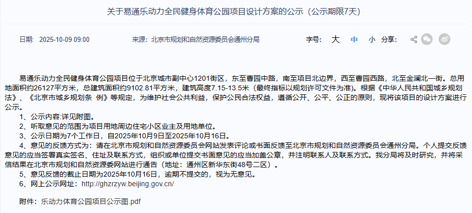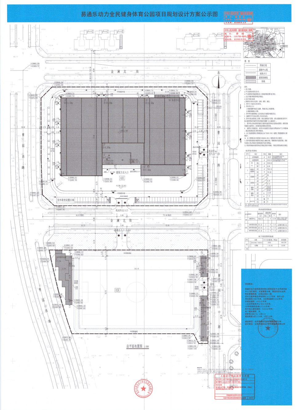 易通乐动力全民健身体育公园项目位于北京城市副中心1201街区,东至曹园中路,南至项目北边界,西至曹园西路,北至金澜北一街。总用地面积约26127平方米,总建筑面积约9102.81平方米,建筑高度7.15-13.5米(最终指标以规划许可文件为准)。