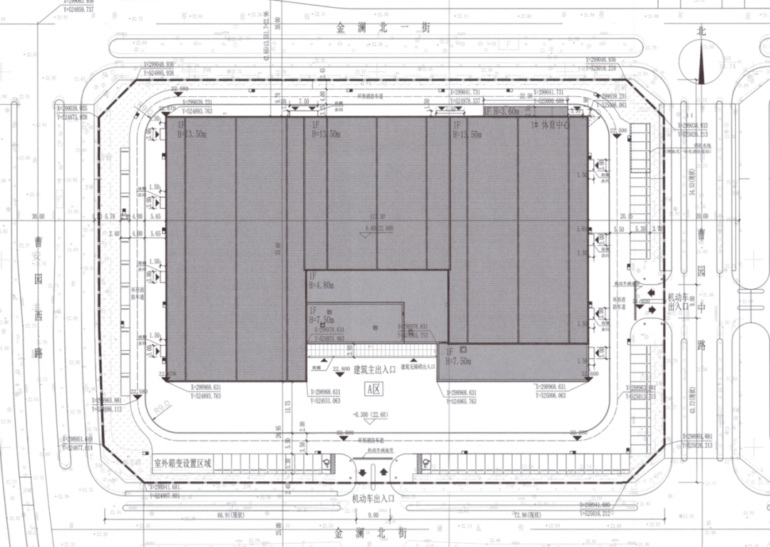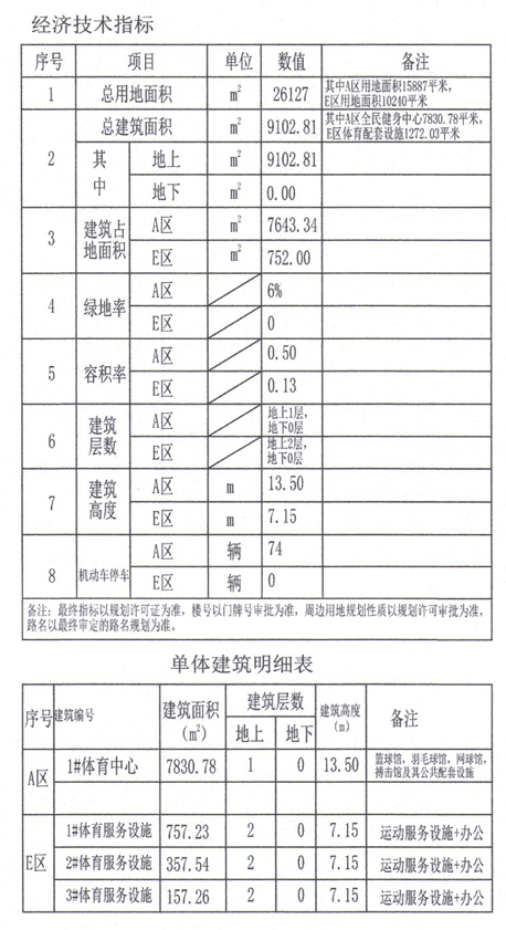 项目方案申报总用地面积26127 平米,其中A区用地面积 15887平米,E区用地面积 10240平米。总建筑面积 9102.81 平米(A区全民健身中心 7830.78 平米,E区体育服务设施 1272.03 平米)。容积率:A区 0.50,E区 0.13。建筑高度:A区 13.50 米,E区 7.15 米。